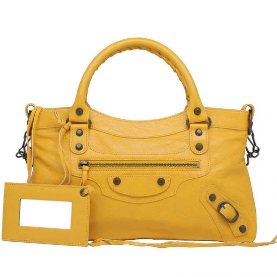Description: Aged brass hardware - top zip closure - hand stitched handles - removable shoulder strap - front zip pocket - leather strings on zips - leather framed hand mirror - interior zip pocket with Balenciaga engraved plaque - made in Italy