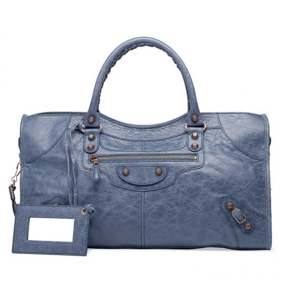 Description: Hand stitched handles - Removable shoulder strap - Top zip closure - Rose gold plated metal hardware - Front zip pocket - Interior zip pocket with Balenciaga embossed leather label - Leather framed hand mirror - Made in Italy.
