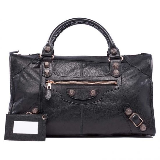 Description: Rose gold plated metal hardware - top zip closure - hand stitched handles - front zip pocket - leather framed hand mirror - interior zip pocket with Balenciaga embossed leather tag - protective metal feet - made in Italy.