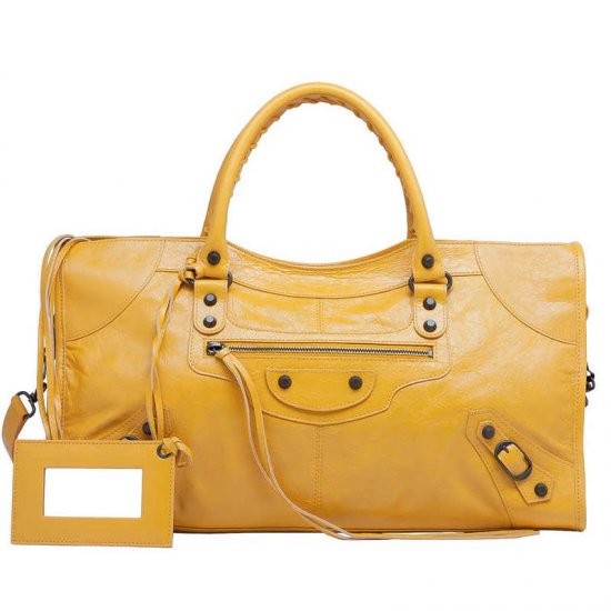 Description: Aged brass hardware - top zip closure - hand stitched handles - removable shoulder strap - front zip pocket - leather strings on zips - leather framed hand mirror - interior zip pocket with Balenciaga embossed leather tag - made in Italy.