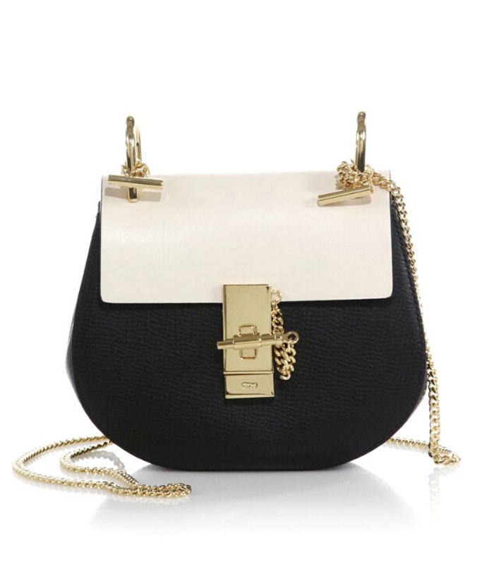 Crafted from bicolor, dual-texture leather in Chloe's signature round silhouette, this effortlessly chic bag features a turnlock-and-pin closure at front and a gleaming chain strap to match.