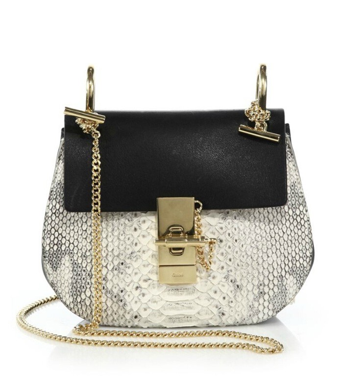 A luxe combination of leather and python is rendered in a petite saddle bag design, its rounded silhouette accented by radiant hardware and a sleek chain strap.