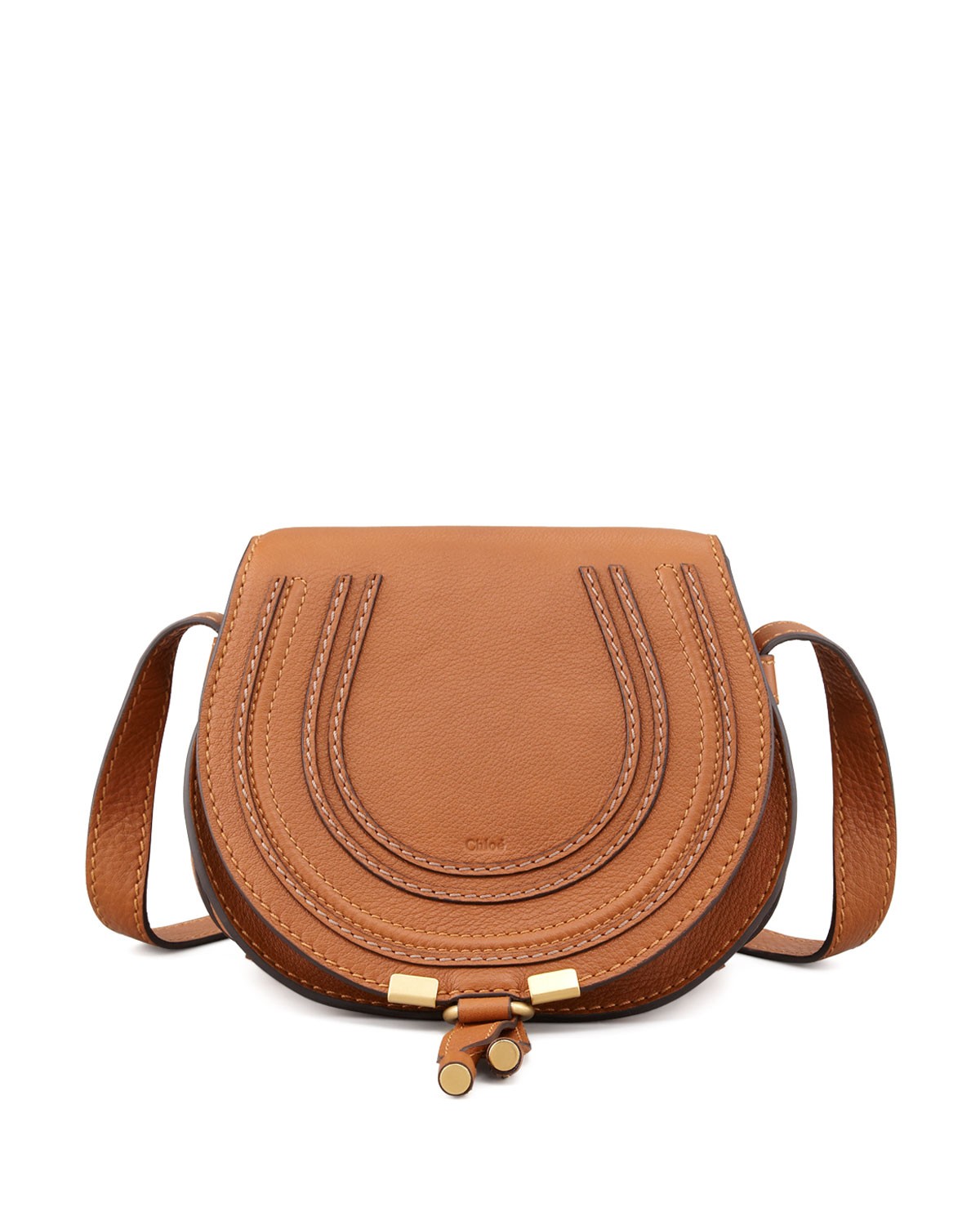 With its pintucked horseshoe flap, the Chloe Marcie mini saddle bag invites you to make your own luck. Tan pebbled leather adds deep color and supple texture to this fuss-free crossbody design.