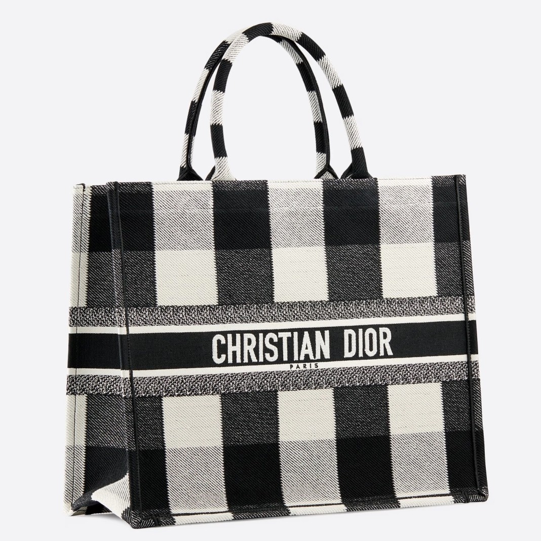 Dior Book Tote Bag In White/Black Check Embroidered Canvas