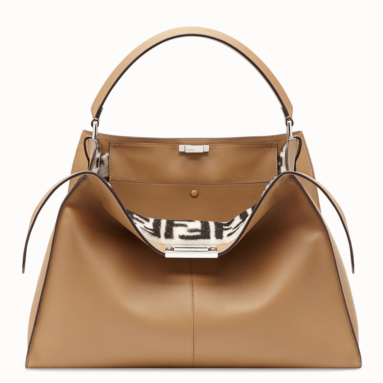 - 100% calfskin leather- Single top handle- Twist lock closure- Lined in grey sheepskin printed with contrasting FF motif- Interior one pocket- Protective feet at baseSize: 43 x 32 x 14 cmComes with Fendi dust bag and certificate card.
