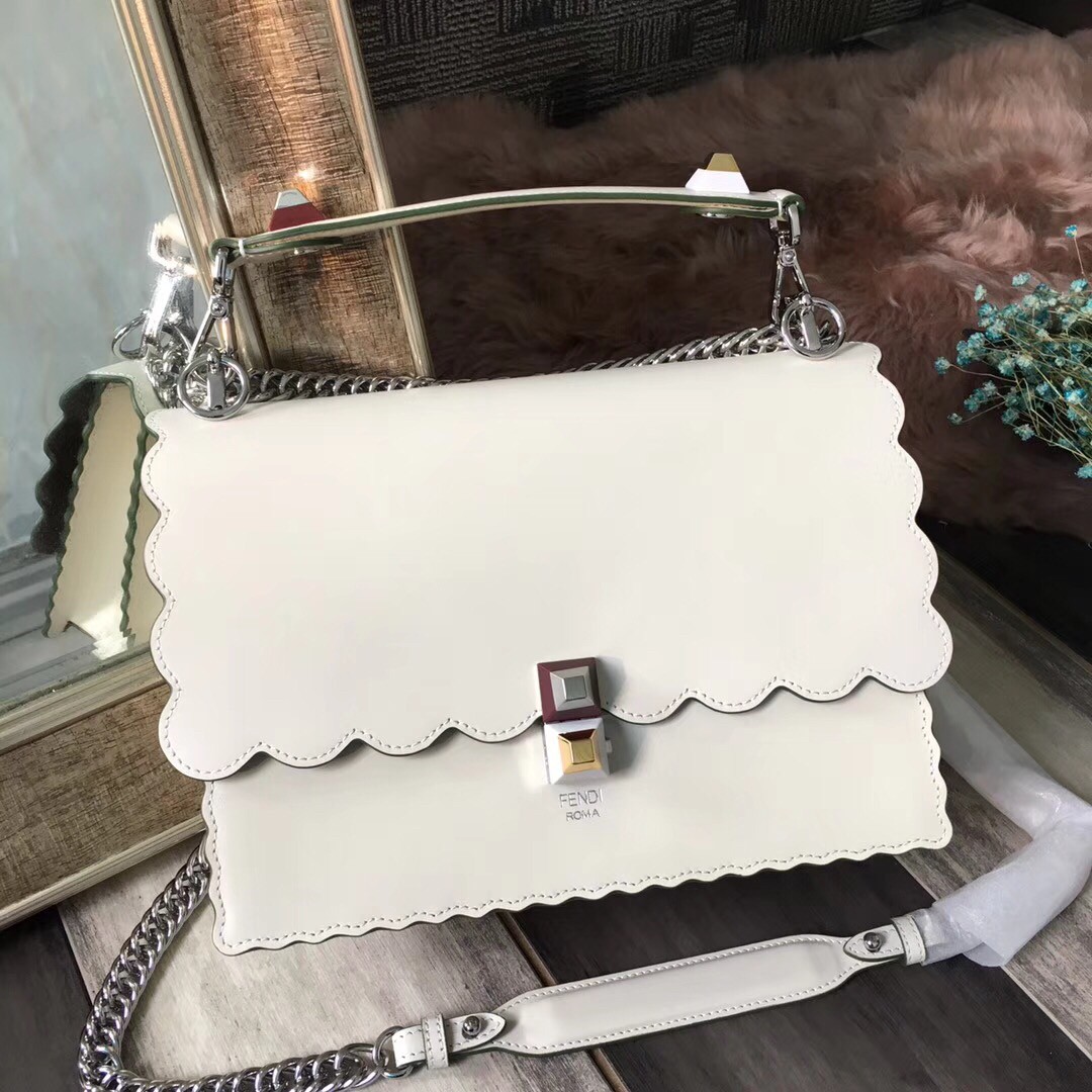 - 100% calfskin leather- Detachable leather handle- Long sliding chain shoulder strap with leather inset- Twist lock with double plexiglass stud- Scalloped edges- Two internal compartments- Suede lining with one patch pocketSize: 25 x 19 x 11 cmComes with Fendi dust bag and certificate card.