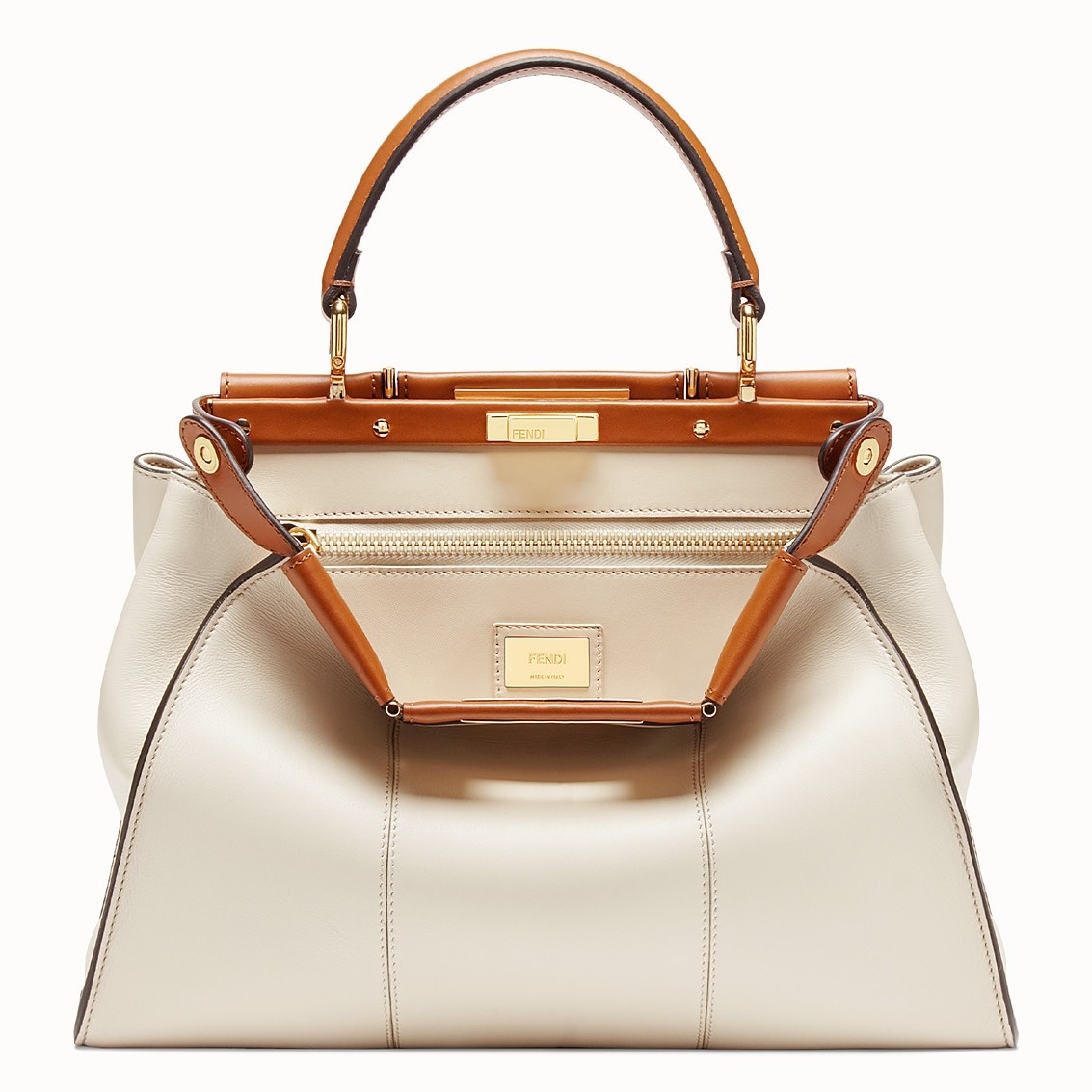 - 100% calfskin leather- Single handle- Adjustable and detachable shoulder strap- Twist lock on both sides- Two compartments divided by a stiff partition- Interior one zip pocket- Gold-finish metalwareSize: 33 x 26 x 12 cmComes with Fendi dust bag and certificate card.