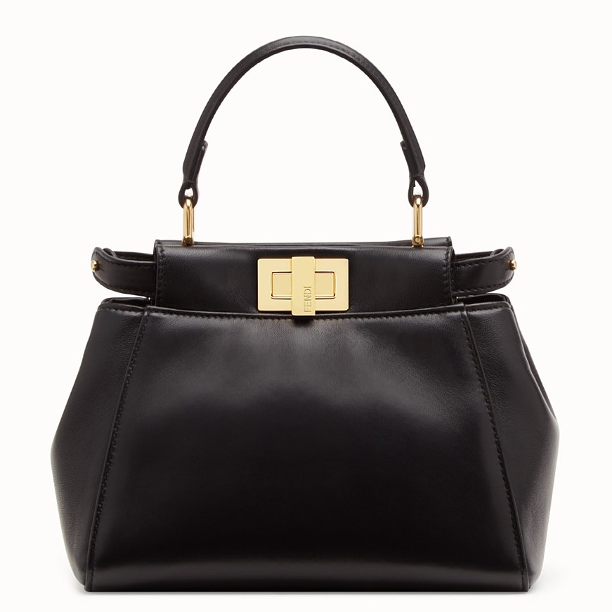 - 100% nappa leather- Single handle- Two compartments divided by a stiff partition- Twist lock on both sides- Adjustable and removable chain shoulder strap with leather insert- Partition lined with tone-on-tone nappa leather- Gold-finish metalwareSize: 19 x 16 x 6 cmComes with Fendi dust bag and certificate card.