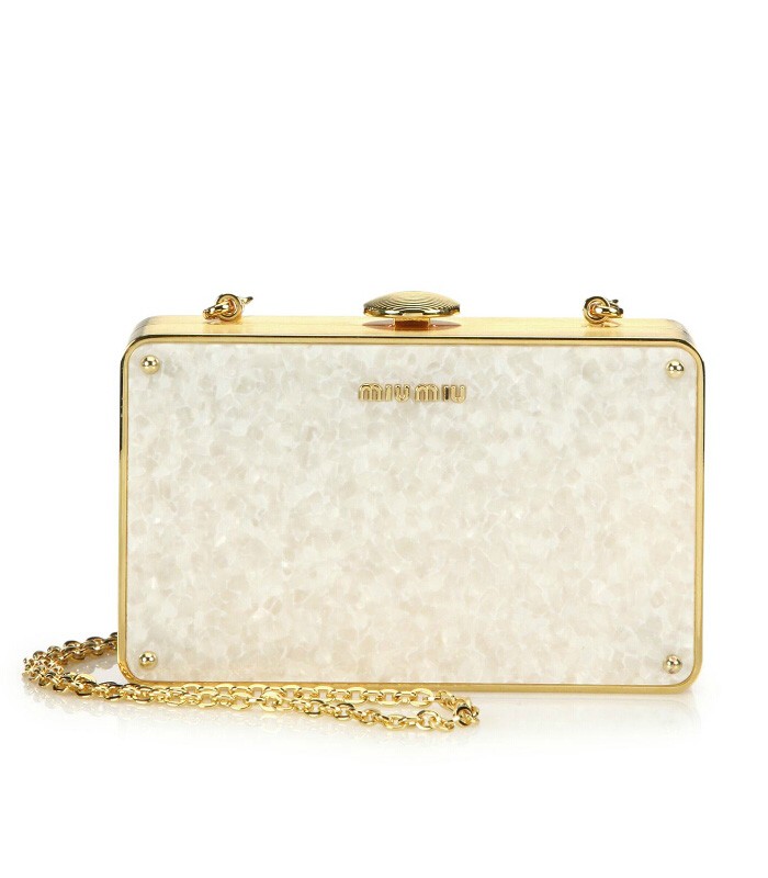 A pearlescent finish elevates this sleekly structured clutch, its front panel crafted of smooth marble and accented by a goldtone metal frame. Includes an optional chain strap that allows the clutch to be carried in hand or across the body.