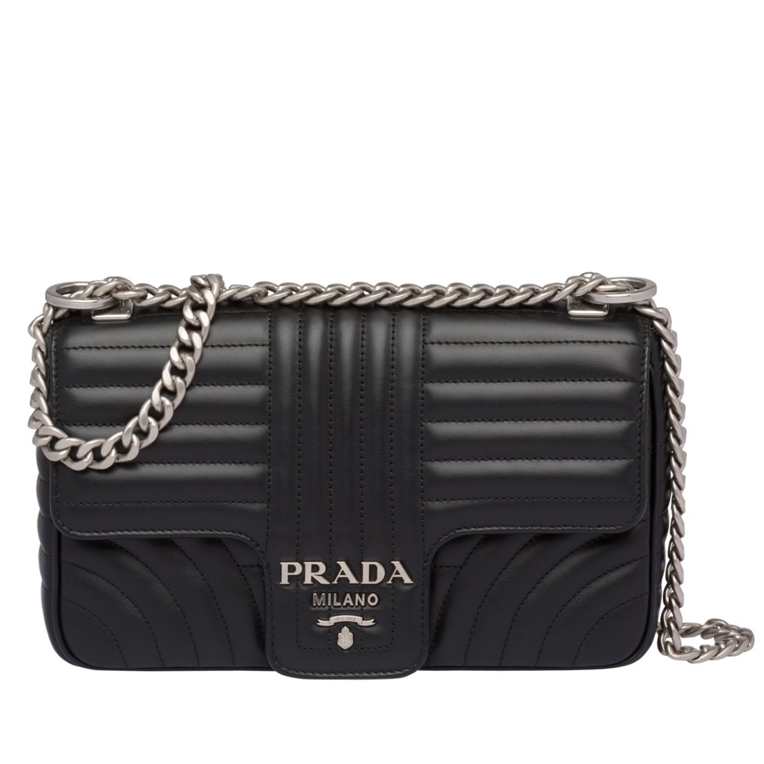- 100% Calfskin- Adjustable chain shoulder strap- Flap and snap closure--Steel-finish hardware- Metal logo lettering- Signature fabric lining- Two inner pockets, one with zipSize: 24 x 14 x 6 cmComes with Prada dust bag and authenticity card.